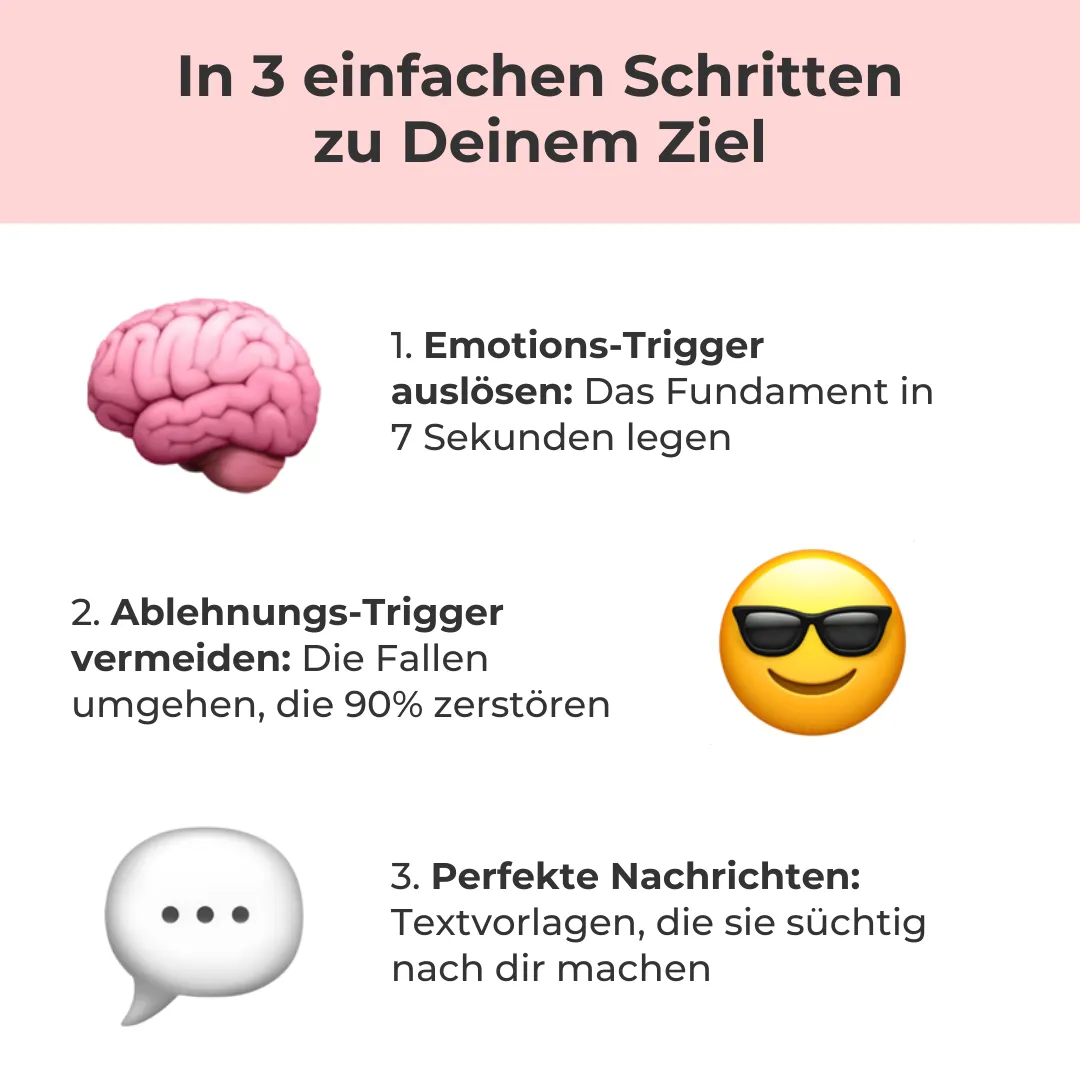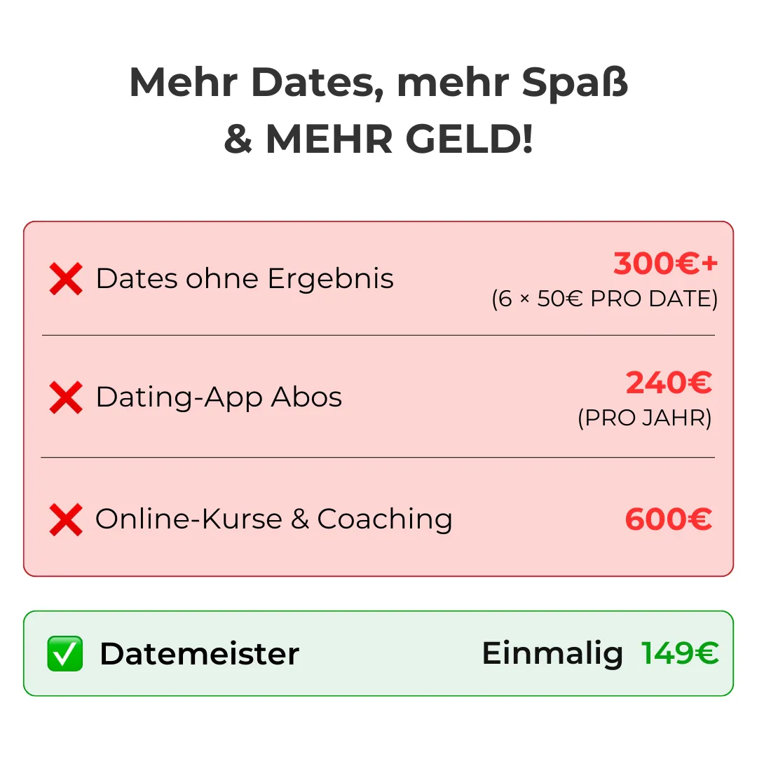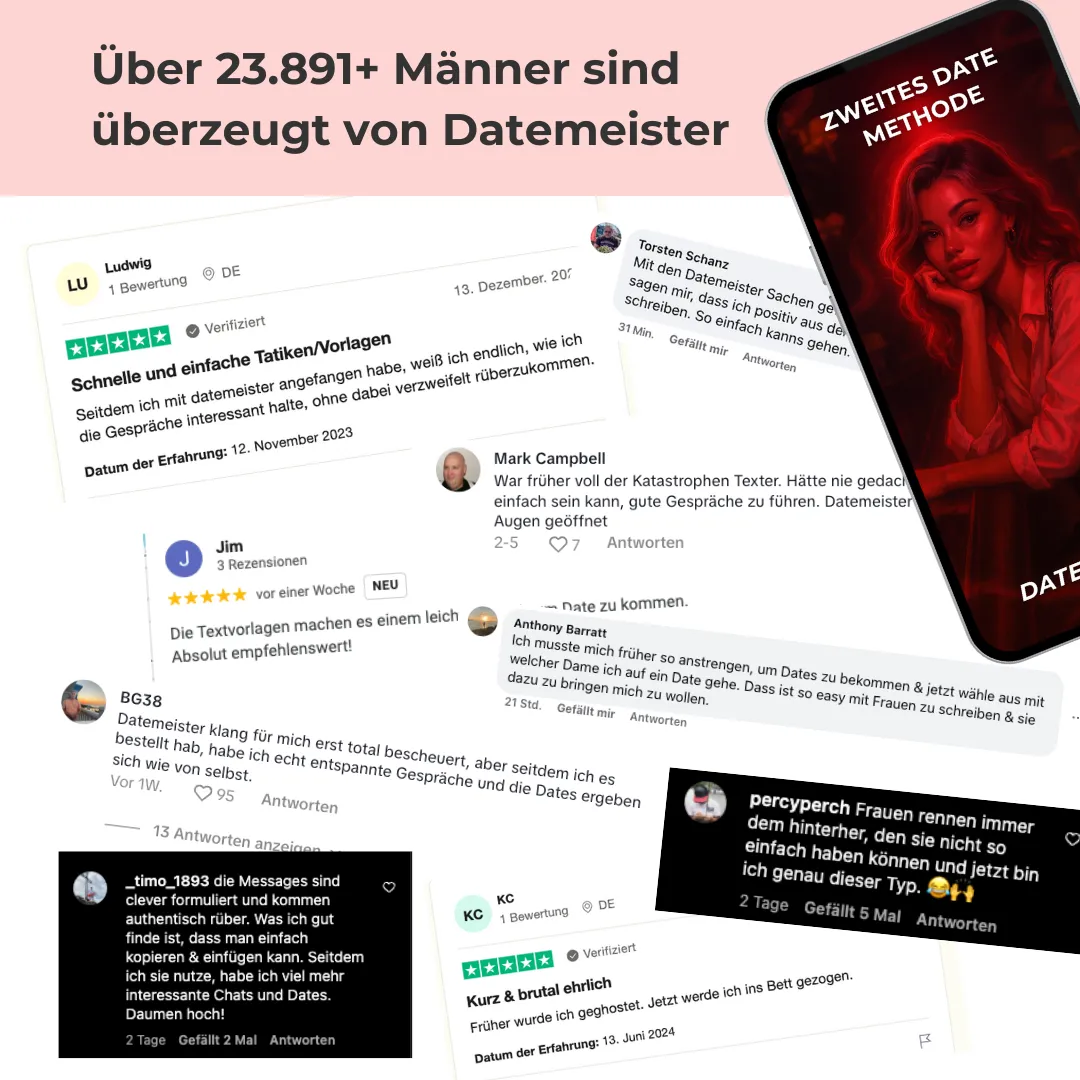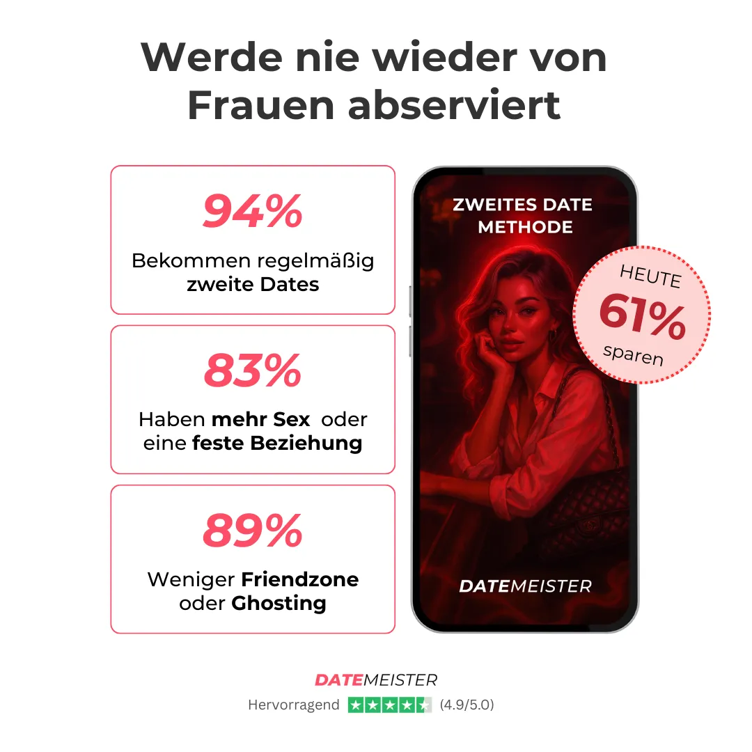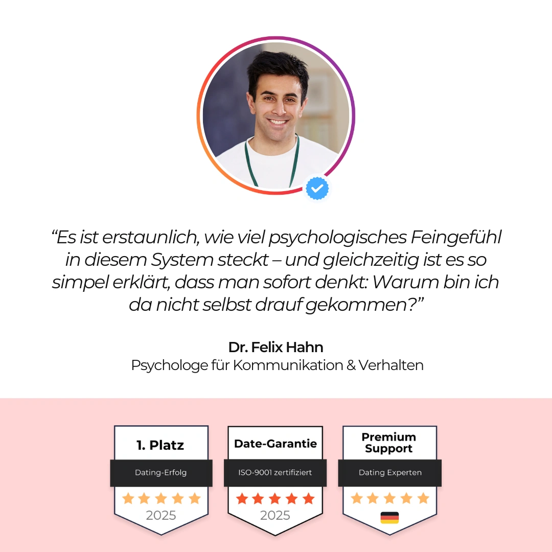 „Endlich mal klare Anleitungen statt Theorie. Vorher hatte ich ständig das gleiche Problem: Ich kam zwar zum ersten Treffen, aber danach war meistens Schluss... Funkstille. Mit der Zweites Date Anleitung hatte ich zum ersten Mal einen genauen Plan, wie ich mich verhalte, damit sie wirklich Lust auf mehr bekommt. Ich habe das Schritt für Schritt umgesetzt, und siehe da.. erstes Date gemacht, zweites sofort fix (sie hat gefragt). Hätte ich das früher gehabt, hätte ich mir viele verpatzte Chancen erspart.“