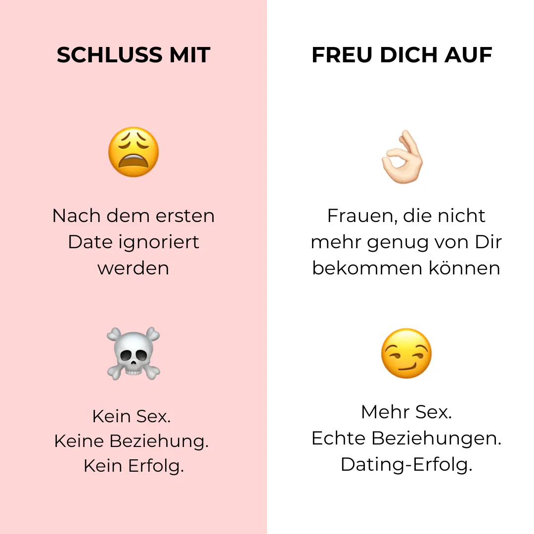 „Früher hab ich beim Date oft zu viel gequatscht oder mich verhalten wie ein netter Kumpel. Jetzt weiß ich, wie ich Spannung aufbaue und gleichzeitig authentisch bleibe. Seitdem ist jedes zweite Date quasi vorprogrammiert.“